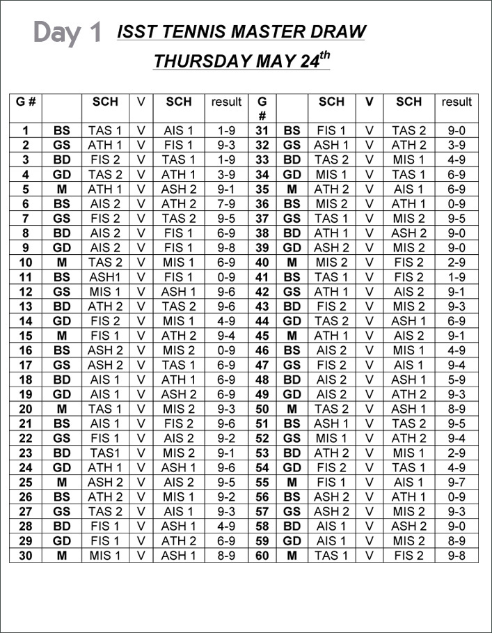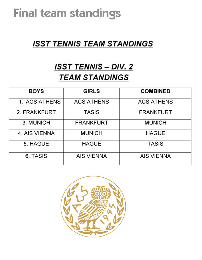 Dear Athletes and Coaches: ACS Athens welcomes you to the ISST Division 2 Tennis Tournament which will take place at the Marathon Tennis Club. We are very happy to be hosting this event in the historic site of Marathon and we hope that everyone will enjoy their stay in Athens. You are all here as representatives of your school, prepared to enter into healthy competition between the participating teams. Enjoy your stay and all the best to all of you. We hope that you will leave with fond memories from this tournament.